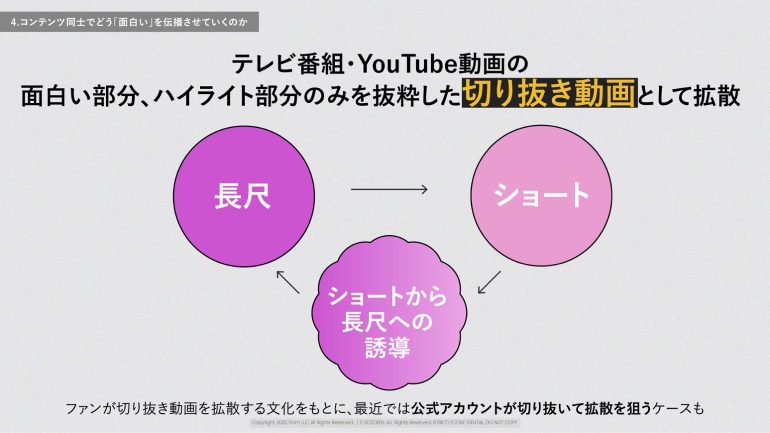 テレビ番組やYouTubeの長尺動画の面白い部分だけを抜粋した「切り抜き動画」がショート動画として拡散される流れを図示。最近では公式アカウント自らが切り抜き動画を投稿するケースも増えていると指摘している。