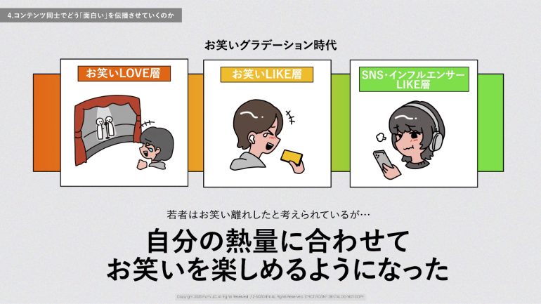 劇場やライブに通う「お笑いLOVE層」から、SNSでインフルエンサーの面白い投稿を見る「SNS・インフルエンサーLIKE層」まで、楽しみ方がグラデーション状になっていると解説している。