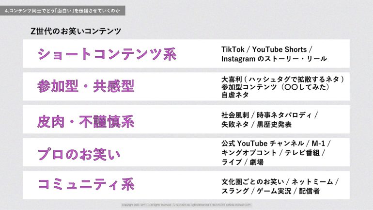 Z世代が楽しむお笑いコンテンツを「ショートコンテンツ系」「参加型・共感型」「皮肉・不謹慎系」「プロのお笑い」「コミュニティ系」の5つに分類。