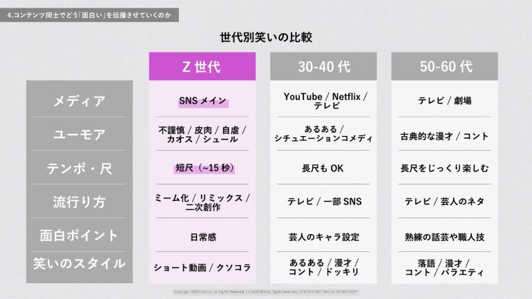 Z世代、30-40代、50-60代の3世代で「笑い」のスタイルを比較。メディア、ユーモア、テンポ・尺、流行り方、面白ポイント、笑いのスタイルの6項目で分析している。Z世代は「SNSメイン」「不謹慎/皮肉/自虐」「短尺(〜15秒)」「ミーム化/二次創作」といった特徴が挙げられる。