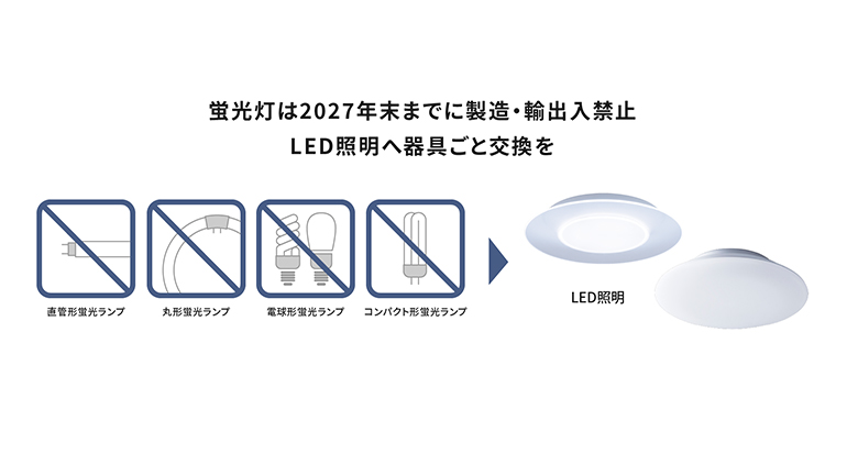 「水銀に関する水俣条約」に基づき、蛍光灯は2027年末までに段階的に製造・輸出入が禁止されます。照明器具の劣化による発火リスクを避けるためにも、蛍光灯からLED照明への器具ごとの交換が推奨されています。