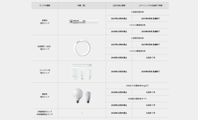 A.「蛍光灯にはさまざまな種類があります。それぞれ、公的な禁止期限とパナソニックの生産終了時期が異なっていますので、こちらの表にまとめましたので、ご確認ください。