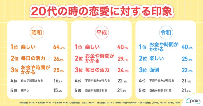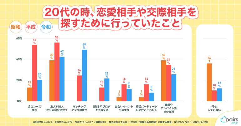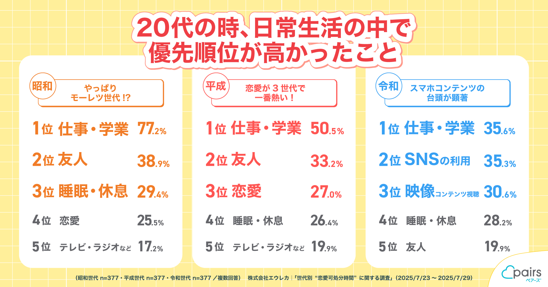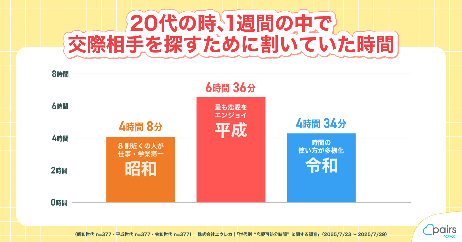 そこで恋活・婚活マッチングアプリ「Pairs(ペアーズ)」を運営するエウレカは、時代と共に変化する恋愛スタイルを紐解くため、調査は、昭和・平成・令和、それぞれの時代で20代を過ごした人を対象に※「“恋愛可処分時間”3世代一斉調査」を実施した。