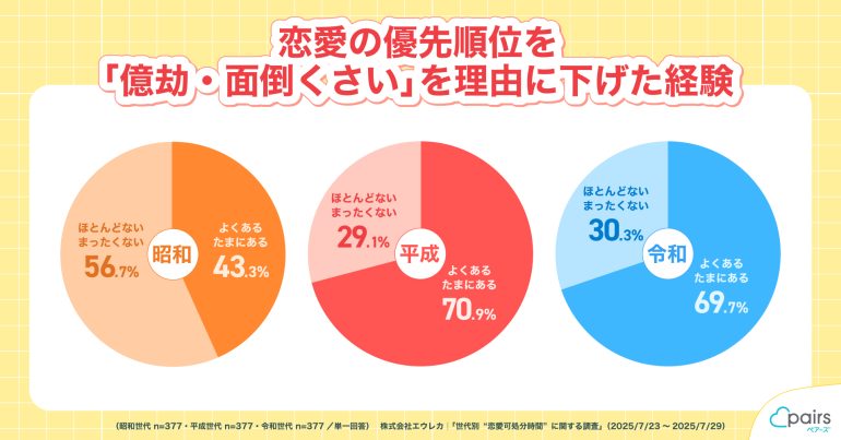 実際、これを裏付けるように「恋愛の優先順位を、億劫・面倒くさいという理由で下げた経験」について尋ねたところ、平成・令和世代は「経験がある」と回答した人が約70%であるのに対して、昭和世代は43.3%と半数以下にとどまる。