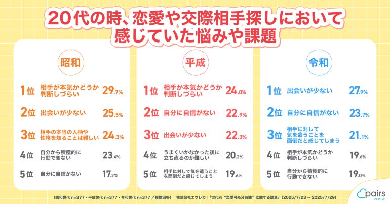 恋愛や交際相手探しにおける悩みや課題は時代とともに移り変わったのだろうか。各世代に尋ねたところ、昭和・平成世代は「相手が本気かどうか判断しづらい」が共に1位だったのに対して、令和世代は4位にとどまった。