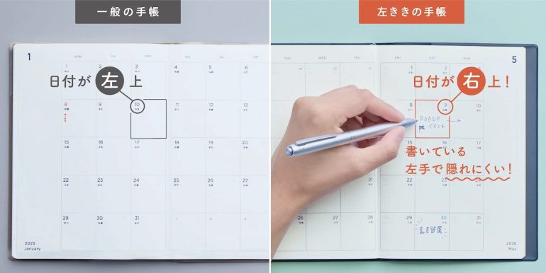 「2020年より販売している当店オリジナルの手帳です。レイアウトや開き方向など、左手で書く人のために企画しました。毎年多くのリピーターの方に支えられている看板商品です」