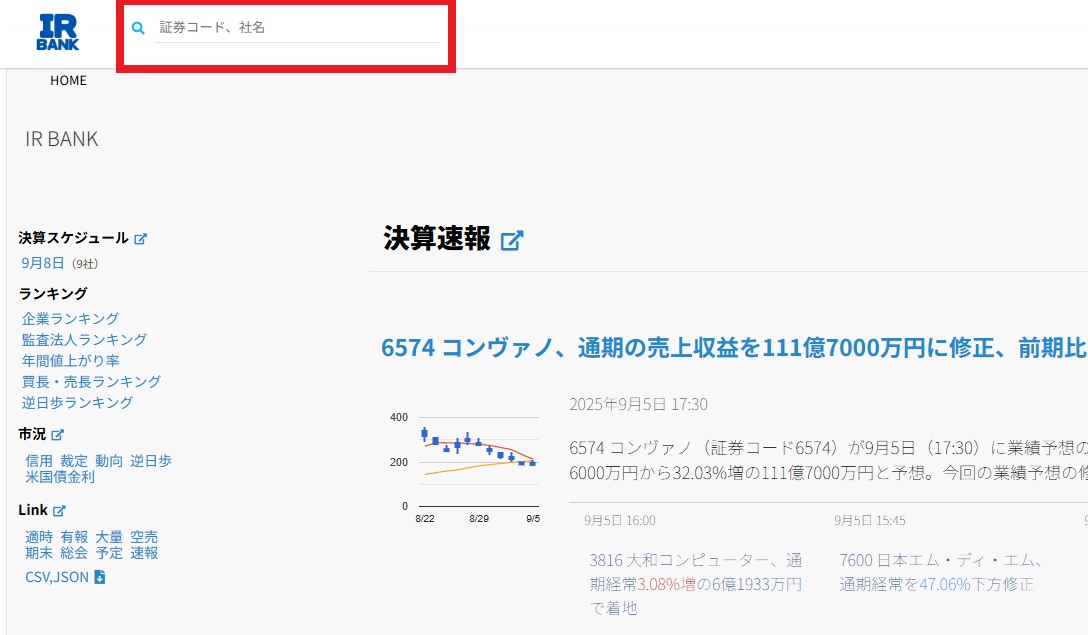 「IR BANK」は2010年頃から直近までの情報(配当金の状況)が掲載されていて、左上の窓に証券コードや社名を入力して調べます。