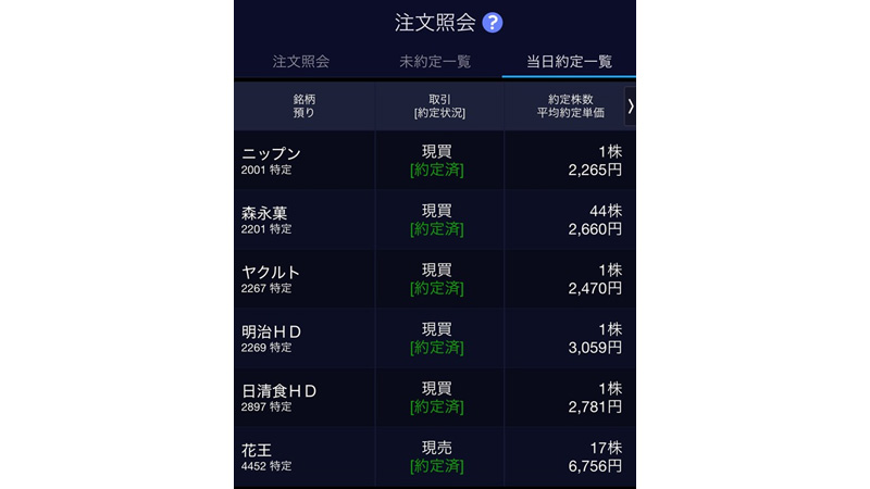 ――たとえば8月19日は、「ニップン(2001)」や「森永製菓(2201)」、「ヤクルト(2267)」などを買われていて、「花王(4452)」を売られています。勝手な推測ですが「森永製菓(2201)」を多く買付しているのは単元化(100株以上にする)を目指されているからかなと思ったのですが……。