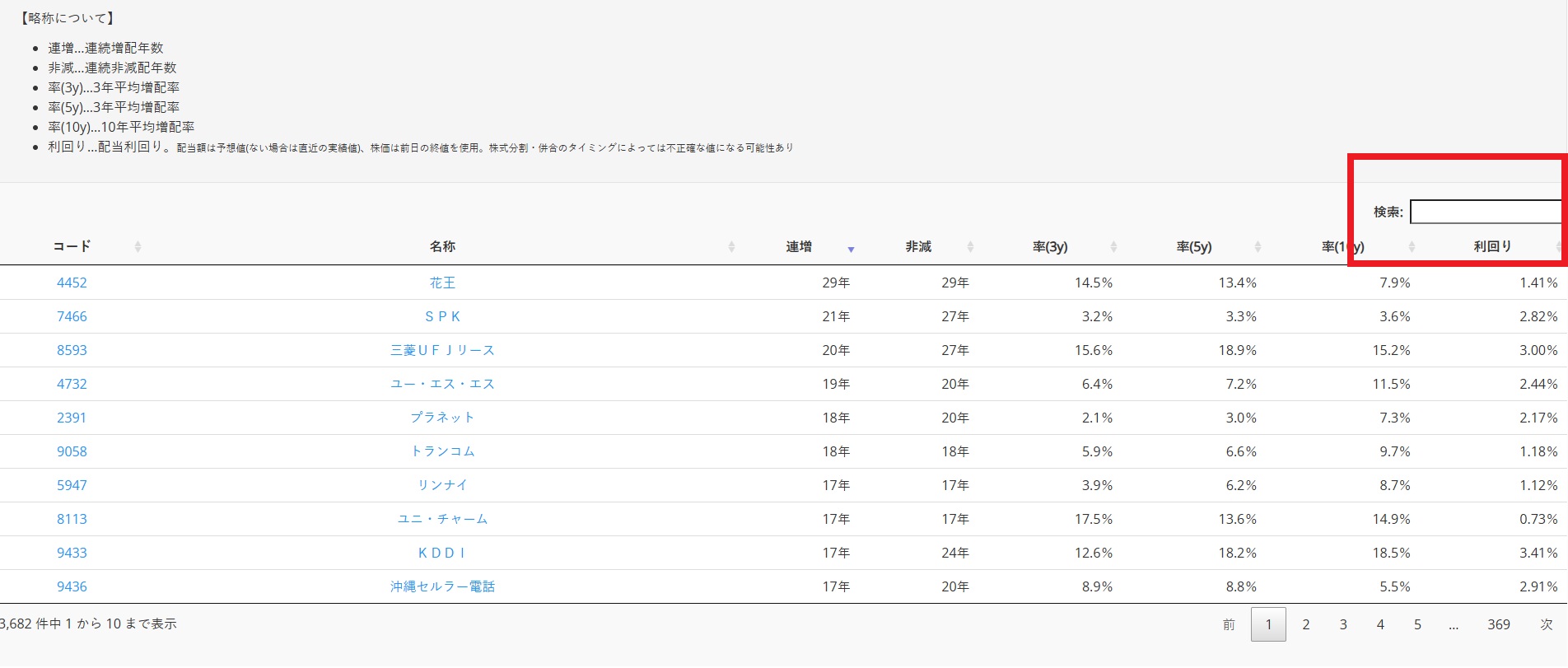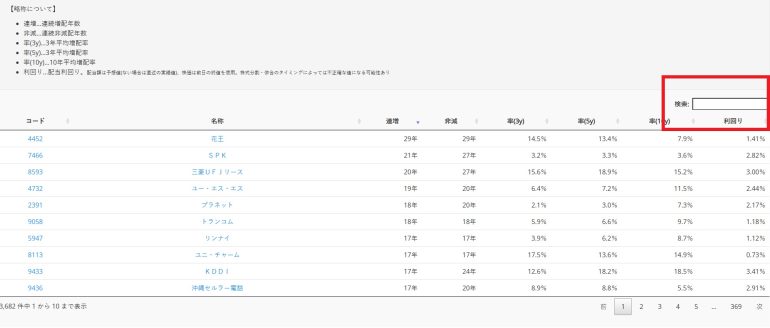 「配当金チェッカー」は1990年頃から2018年頃までの情報が掲載されていて、こちらもサイト内の検索窓に企業名を入れると連続増配年数、連続日減配年数などがわかります。