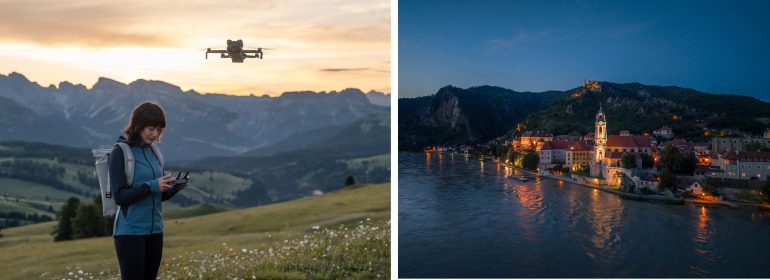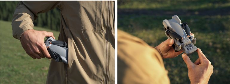 具体的には、ポートレート、クローズアップ、遠距離撮影などのニーズに応じて、高度なカメラワークを実行する「マスターショット」や、回転、ドローニー、サークル、ヘリックス、ロケット、ブーメラン、アステロイドなど様々なモードに対応し、スタイリッシュなショートムービーを簡単に撮影できる「クイックショット」、手動で選択した被写体や領域を基に複数の画像を繋ぎ合わせて、シームレスなパノラマ写真を作成する「フリーパノラマ」が利用可能。また、Bluetooth範囲内でDJI Flyアプリを介したリモートウェイクアップにも対応しており、ドローンや送信機を取り出すことなく、Wi-Fi 6を介して最大100 MB/sでファイルを転送することができる。