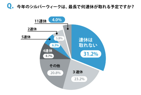 「今年のシルバーウィークは、最長で何連休が取れる予定ですか?」と尋ねたところ、最も多かった回答は「連休は取れない」(31.2%)となった。つまり、約3人に1人がまとまった休暇を取れない見通しだ。次いで多いのは「3連休」(23.2%)で、「11連休」といった大型休暇を取れる人はわずか4.0%にとどまった。
