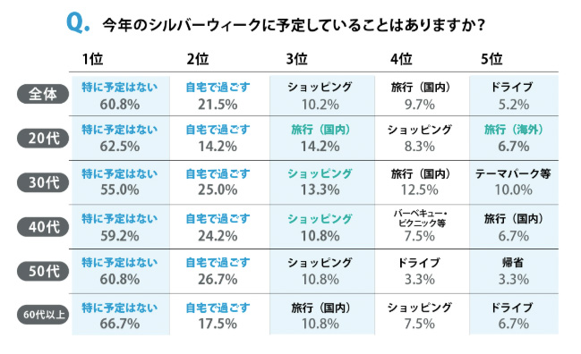 今年のシルバーウィークの過ごし方については、全年代で「特に予定はない」「自宅で過ごす」が最多となり、“遠出を控える”傾向が浮き彫りとなった。