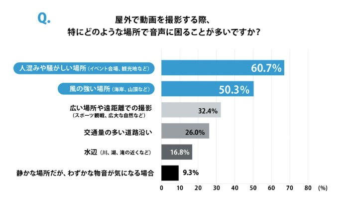 動画撮影時に音で困ったことがある人に対し、具体的な場所を尋ねたところ、「人混みや騒がしい場所(イベント会場・観光地など)」が最多で6割(60.7%)、「風の強い場所(海岸・山頂など)」が半数(50.3%)と、にぎやかな場所や自然環境が“大きな敵”であることが明らかになった。