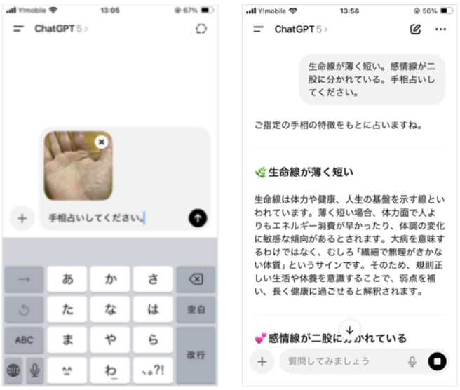 ChatGPTは入力情報を解釈して文章を返す。写真を送れば線の長さや形を読み取り、テキスト入力なら「生命線が短い」といった条件を説明することで、対応する手相の意味を提示する。