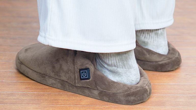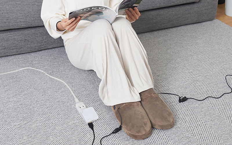 本製品は、足底にヒーターを搭載したUSB式の電気スリッパ。モバイルバッテリー(別売)を本体のポケットに入れてコードレス感覚で使えるのが特長だ。