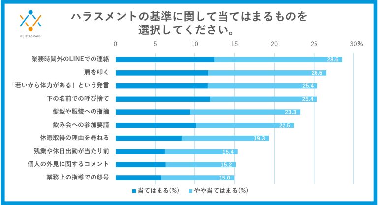 業務内で行われる様々な行為について、「ハラスメントの基準に関して当てはまるものを選択してください」という質問に対し、5段階で評価を収集した。ハラスメントとみなす割合(当てはまる/やや当てはまると回答)で、最も多い結果となったのは、「業務時間外のLINE連絡」が28.6%(非管理職30.6%/管理職26.6%)という結果になった。