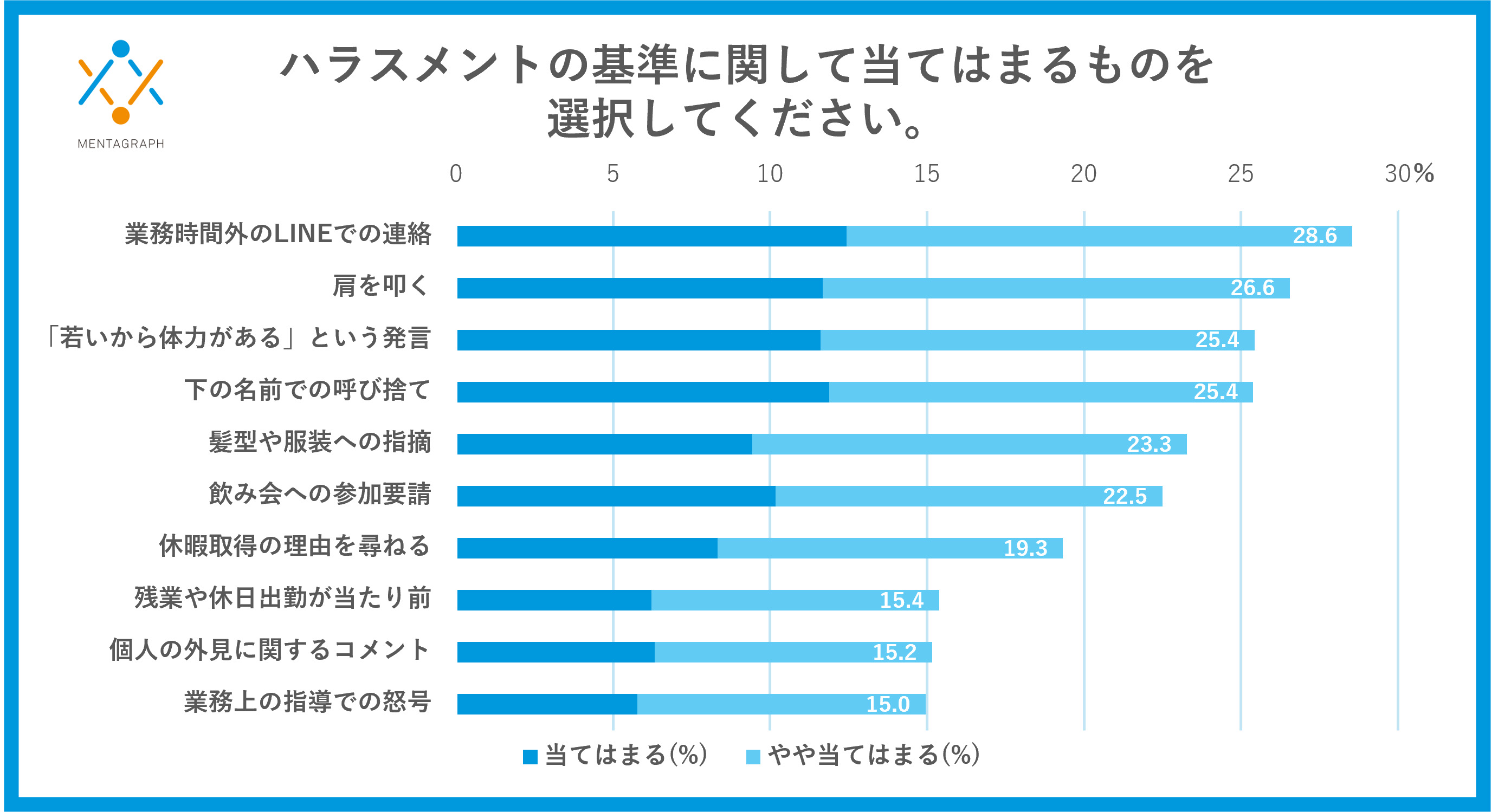業務内で行われる様々な行為について、「ハラスメントの基準に関して当てはまるものを選択してください」という質問に対し、5段階で評価を収集した。ハラスメントとみなす割合(当てはまる/やや当てはまると回答)で、最も多い結果となったのは、「業務時間外のLINE連絡」が28.6%(非管理職30.6%/管理職26.6%)という結果になった。
