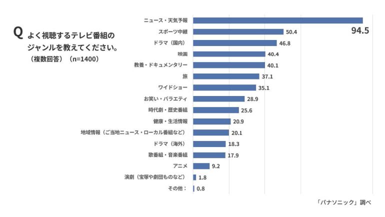 よく視聴するテレビ番組のジャンルでは、「ニュース・天気予報」が94.5%と圧倒的な結果だった。ニュースや天気予報以外のジャンルでは、「スポーツ中継」は関西圏平均が49.5%で関東圏平均は51.5%、「歌番組・音楽番組」は関東圏平均が16.3%に対して関西圏平均は20.2%で、地域差のある結果になった。ニュースや天気予報のような生活のルーティンで観る番組は全国共通だが、娯楽として観るスポーツや歌番組などでは地域性が出る結果さったという。