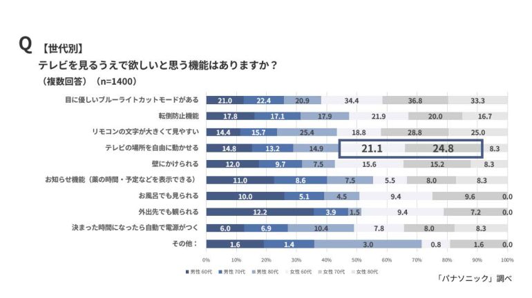 テレビを見るうえで欲しいと思う機能についての質問では、「特にない」と回答した人が44.7%で最多だった。「目に優しいブルーライトカットモード」と答えた人が24.3%で、毎日テレビを見ることから目への配慮を考えている人は多いようだ。「テレビの場所を自由に動かせる」を選んだ層は60代から70代の女性が中心で、いずれも2割以上だった。家事をしながらの“ながら視聴”を快適にしたい人が多いことがうかがえる結果といえる。