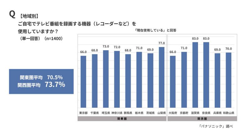 自宅でテレビ番組を録画する機器であるレコーダーなどを使用しているかという質問では、71.9%が「現在使用している」と回答。高齢者の7割以上がレコーダーを利用していた。地域別では、「関東圏」が平均で70.5%、「関西圏」が平均で73.7%だった。どちらの地域も7割を超えたが、関西圏が約3ポイント高い結果になった。レコーダーを利用する理由では、85.1%が「リアルタイムで見られない時に後から視聴するため」と回答しており、続く回答では「すぐには見ないが必要なときに見るかもしれないから」が24.3%、「気に入った番組をコレクションとして残しているため」が21.2%で、視聴以外の目的で録画を活用している人も一定数いるようだ。シニア層の使い方としては、レコーダーは単なる“見逃し対策”だけでなく、将来の視聴や保存などの多様なニーズを満たす役割を担っているという。