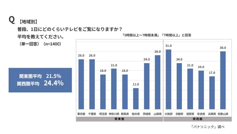 1日にどのくらいテレビ視聴するかという質問では、「3時間以上~5時間未満」と「5時間以上~7時間未満」と「7時間以上」を合わせると53.1%で、高齢者の半数以上が1日3時間以上テレビを視聴しているという。「7時間以上」と回答した人も9.4%と約1割もいるので、シニア層の長時間視聴の傾向が浮き彫りになったといえる。地域別の1日「5時間以上」テレビを視聴する人の割合は、関東圏平均21.5%に対して関西圏平均は24.4%と約3ポイント高く、地域によって生活の中でのテレビ視聴の割合に差があることもわかったという。
