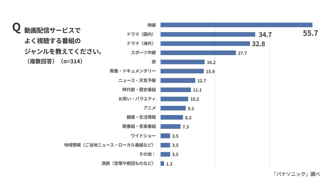 テレビで動画配信サービスを利用する高齢者を対象に、動画配信サービスの視聴頻度を質問すると44.9%が「ほぼ毎日視聴している」と回答した。動画配信サービスでよく視聴する番組のジャンルでは、「映画」が最多の55.7%、次いで「国内ドラマ」が34.7%、「海外ドラマ」が32.8%という結果になった。動画配信サービスは、“日常的な趣味”として定着して娯楽の幅を広げる存在になっているといえるだろう。