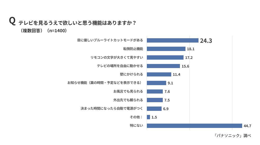 テレビを見るうえで欲しいと思う機能についての質問では、「特にない」と回答した人が44.7%で最多だった。「目に優しいブルーライトカットモード」と答えた人が24.3%で、毎日テレビを見ることから目への配慮を考えている人は多いようだ。「テレビの場所を自由に動かせる」を選んだ層は60代から70代の女性が中心で、いずれも2割以上だった。家事をしながらの“ながら視聴”を快適にしたい人が多いことがうかがえる結果といえる。