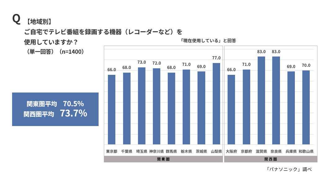 自宅でテレビ番組を録画する機器であるレコーダーなどを使用しているかという質問では、71.9%が「現在使用している」と回答。高齢者の7割以上がレコーダーを利用していた。地域別では、「関東圏」が平均で70.5%、「関西圏」が平均で73.7%だった。どちらの地域も7割を超えたが、関西圏が約3ポイント高い結果になった。レコーダーを利用する理由では、85.1%が「リアルタイムで見られない時に後から視聴するため」と回答しており、続く回答では「すぐには見ないが必要なときに見るかもしれないから」が24.3%、「気に入った番組をコレクションとして残しているため」が21.2%で、視聴以外の目的で録画を活用している人も一定数いるようだ。シニア層の使い方としては、レコーダーは単なる“見逃し対策”だけでなく、将来の視聴や保存などの多様なニーズを満たす役割を担っているという。