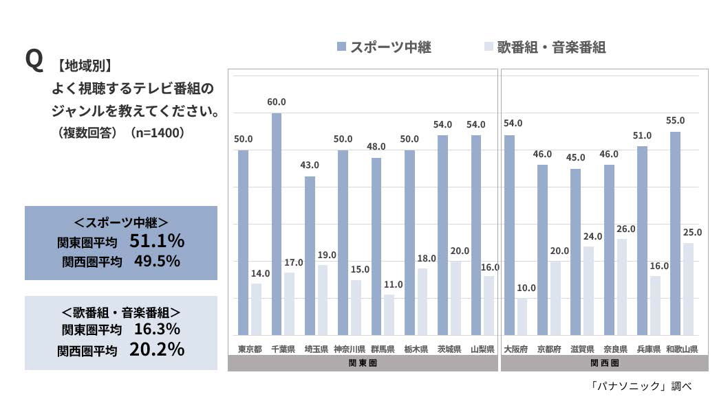 よく視聴するテレビ番組のジャンルでは、「ニュース・天気予報」が94.5%と圧倒的な結果だった。ニュースや天気予報以外のジャンルでは、「スポーツ中継」は関西圏平均が49.5%で関東圏平均は51.5%、「歌番組・音楽番組」は関東圏平均が16.3%に対して関西圏平均は20.2%で、地域差のある結果になった。ニュースや天気予報のような生活のルーティンで観る番組は全国共通だが、娯楽として観るスポーツや歌番組などでは地域性が出る結果さったという。