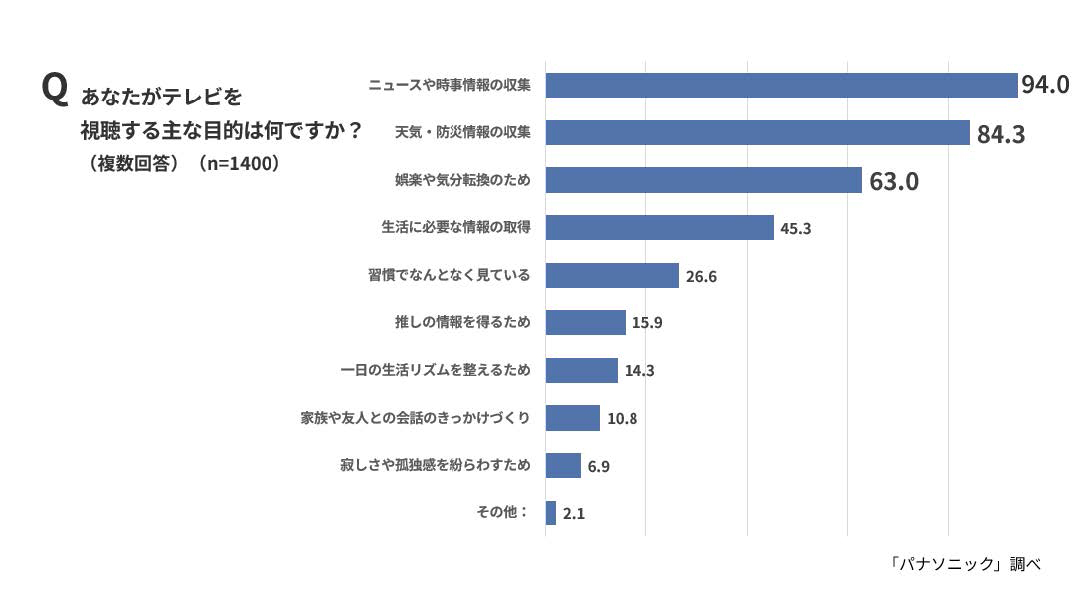 テレビは日々の生活においてどのようなものかという質問では、「毎日の生活に欠かせない存在」が72.3%で最多だった。テレビを視聴する主な目的では、「ニュースや時事情報の収集」が94.0%と非常に高い数字になった。それに続くのが「天気・防災情報の収集」が84.3%、「娯楽や気分転換のため」が63.0%だった。シニア世代では、いまだにテレビが新たな情報の入手源として機能しており、高齢者の暮らしを支える重要な存在といえるだろう。