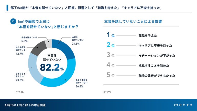 部下に対して「1on1や面談で上司に『本音を話せていない』と感じますか?」と質問すると、「本音を話せていないと感じる」(21.6%)と「あまり本音を話せていないと感じる」(36.8%)と「どちらとも言えない」(23.8%)を合わせた82.2%が本音を話せていないと回答している。それによって転職を考えたことやキャリアに不安を持ったこともあるという。