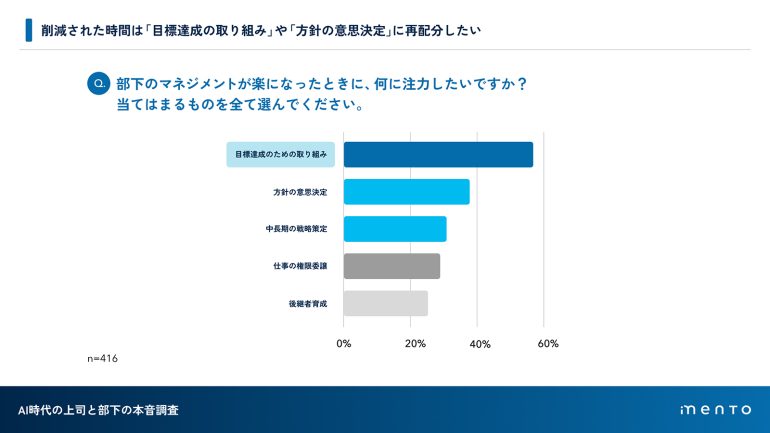 上司に「部下のマネジメントが楽になったときに、何に注力したいですか?」と質問すると、「目標達成のための取り組み」(57.2%)、「方針の意思決定」(38.2%)が挙げられた。