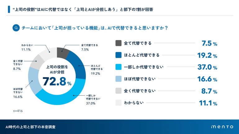 部下に対して「チームにおいて『上司が担っている機能』はAIで代替できると思いますか?」と質問すると、「すべて代替できる」と答えたのは7.5%と1割以下だった。「ほとんど代替できると思う」(19.2%)、「一部しか代替できないと思う」(37.0%)、「ほぼ代替できないと思う」(16.6%)を合わせた72.8%が上司とAIが役割を分担し合うと思っているようだ。