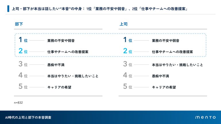 上司・部下が話したい本音の1位は「業務の不安や弱音」