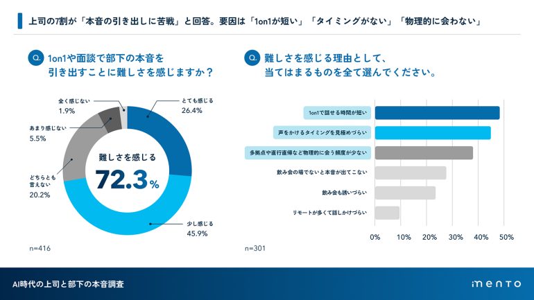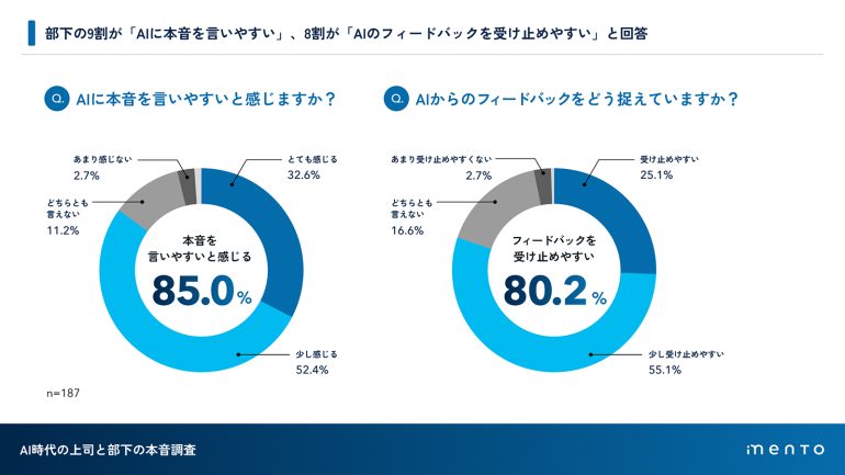 今回の調査を行ったmentoの木村憲仁CEOは、次のようにコメントしている。「上司の7割が「部下の本音を引き出すことに苦戦」していることが明らかになりました。現場の管理職の方々の話を聞くなかでも、管理限界を超えた人数をマネジメントしていたり、テレワークや直行直帰で状況が見えなかったりと、プレイングマネージャーをしながらひとりずつメンバーと向き合うことの難しさをよく耳にします。そんな中で部下の9割が「AIに本音を言いやすい」と回答していることも特筆すべき点です。AI時代のマネジメントでは、AIが事前に情報整理やケアを担い、上司とAIが役割を分担することができると考えています」