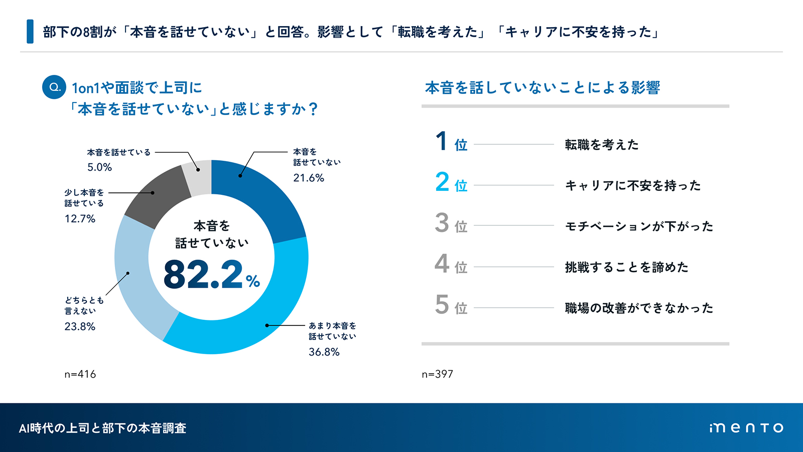 部下に対して「1on1や面談で上司に『本音を話せていない』と感じますか?」と質問すると、「本音を話せていないと感じる」(21.6%)と「あまり本音を話せていないと感じる」(36.8%)と「どちらとも言えない」(23.8%)を合わせた82.2%が本音を話せていないと回答している。それによって転職を考えたことやキャリアに不安を持ったこともあるという。