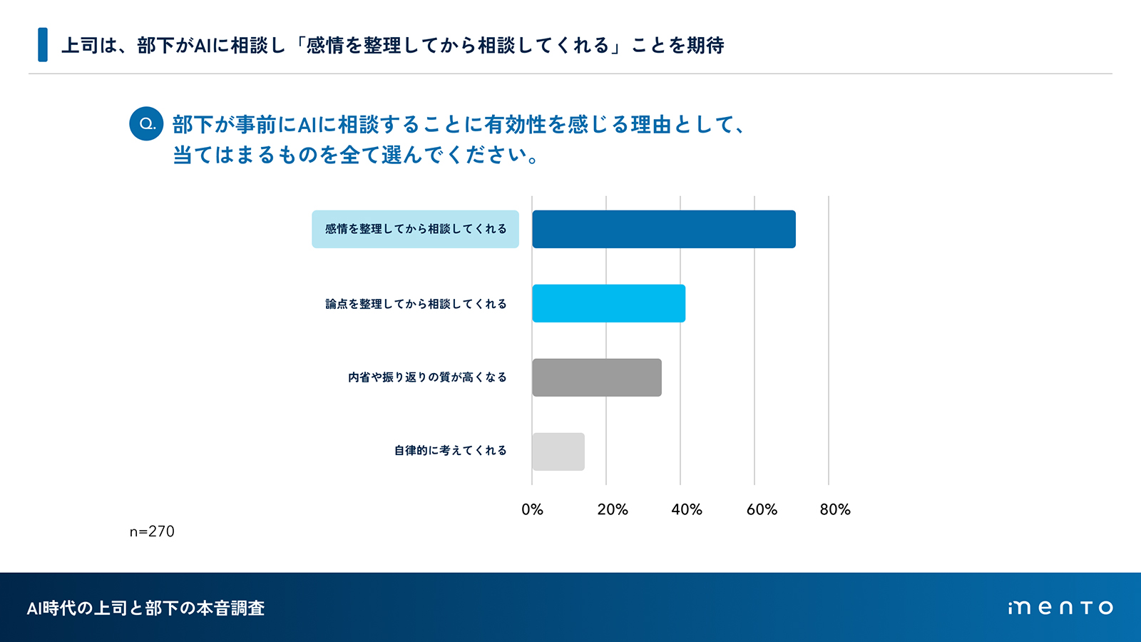 AIが事前に部下の相談やケアを担うことに有効性を感じている上司に対して「有効性を感じる理由」について質問すると、「感情を整理してから相談してくれる」(70.7%)ことにもっとも期待していた。