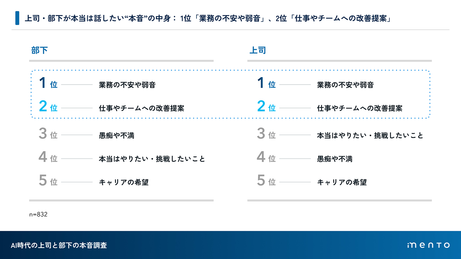 ここでいう「本音」とは、愚痴や不満だけでなく、業務の不安や弱音、キャリアの希望、チームへの改善提案など多面的なもので、上司も部下も本当は「業務の不安や弱音」を話したいけれど話せていない実情があったという。