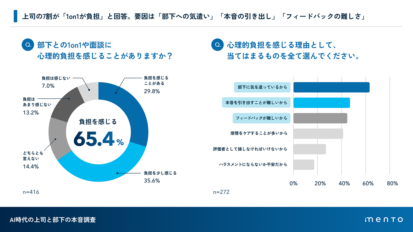 上司に対して「部下との1on1や面談に心理的負担を感じることがありますか?」と質問すると、「負担を感じることがある」(29.8%)と「負担を少し感じることがある」(35.6%)を合わせて65.4%が負担を感じているという。理由では、「部下に気を遣っているから」(62.5%)、「本音を引き出すことが難しいから」(44.1%)、「フィードバックが難しいから」(43.0%)が上位となった。