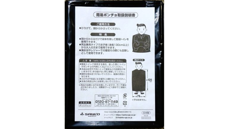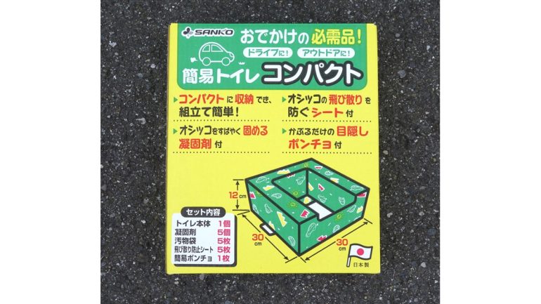もっとも、我慢の限界に達したときには、それから「簡易トイレコンパクト」を組み立てている猶予はない。あらかじめ組み立てて汚物袋をセットし、車内に用意しておくことを推奨する(凝固剤は使用時に開封すること)。余計なお世話かもしれないが、「大」の際は付属のポンチョを被りつつ、窓を開けての換気は不可欠。合わせて無香の消臭剤を用意しておくといいだろう。