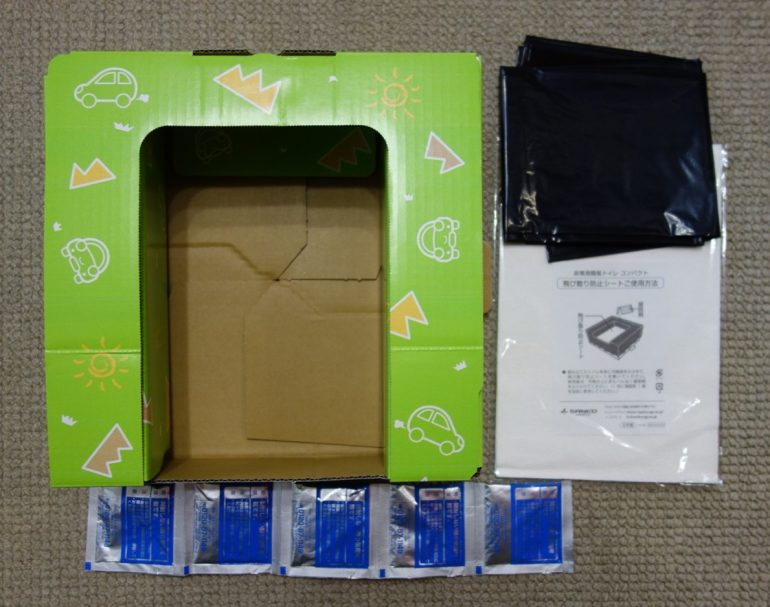 何しろ簡易的な筒状の非常用トイレではなく、”座席に置いて使える”、薄い箱型で本体が便座のようになるコンパクトタイプの簡易トイレなのだ。商品としては本体1個、汚物袋5枚、飛び散り防止シート5枚、凝固剤5個、ポンチョ1枚がセットされていて、使い方としては、車内に置いてもジャマにならないパッケージサイズ30.6×25.5×9.2㎝、741gの段ボール製の箱本体からセット用品を取り出し、本体を組み立て、本体に汚物袋をかぶせ、飛び散り防止シートを底に敷き、U字型の便座状になっている本体に座るだけ。
