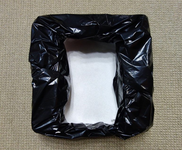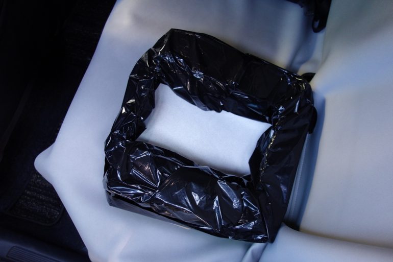 ただ、あらかじめ組み立てて汚物袋をセットした「簡易トイレコンパクト」を、そのままクルマに積んでおくのはちょっと抵抗があるので、あらかじめもう1枚の汚物袋でくるんでおくといい。「小」で使用した汚物袋はそのまま口元を縛るだけでいいのだが、「大」で使用した汚物袋は組み立て済の「簡易トイレコンパクト」をくるんでおいたもう1枚のきれいな汚物袋に入れてしっかり口元を縛り、二重に密封しておけば、車内の臭い対策になるだろう(ゴミの廃棄はしかるべき場所に)。