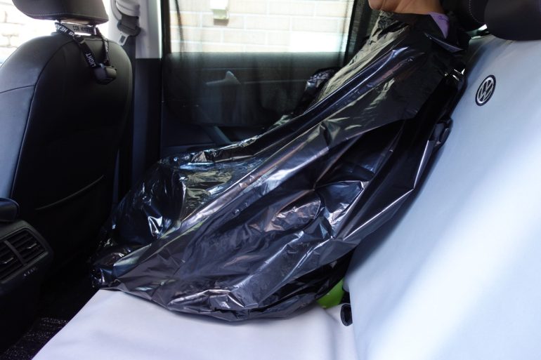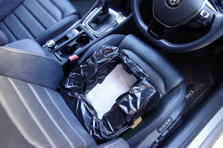 さて、筆者の最大の関心は、運転席でも使えるか、ドライバーでも用を足せるか?だ。そこで実際にあくまで停車時にどうなるかを検証。テストした車両はコンパクトハッチバック/ワゴンのVWゴルフ7.5で、前席のシート座面長530mm、後席座面長480mm(簡易トイレコンパクトの平置きサイズは縦横ともに30㎝)。身長172cmの筆者のドライビングポジション基準で前席頭上に180mm、後席頭上に150mmのスペースがあるクルマである。テスト前に気になったのは、室内高がミニバンやスーパーハイト系軽自動車ほど余裕がないハッチバック/ワゴン車で、高さ120mmの「簡易トイレコンパクト」を前後席に置いて座った際、座高が120mm高くなるわけで、頭がつかえないか?ということ。が、筆者の座高、上記の車内のスペックで、前後席ともに頭がつかえることはなかった。単純な計算式では、前席頭上180mmから「簡易トイレコンパクト」の高さ120mmを引いても頭上に60mm余り、後席頭上150mmから「簡易トイレコンパクト」の高さ120mmを引いても頭上に30mm余る計算になるからだ(利用者の身長、座高による)。なお、テスト車の後席には、普段から愛犬を安全に乗せるためサークルを設置してあるため、その下に常時、防水シートカバーを敷いてある。「簡易トイレコンパクト」と防水シートカバーを組み合わせれば万全ではないだろうか。