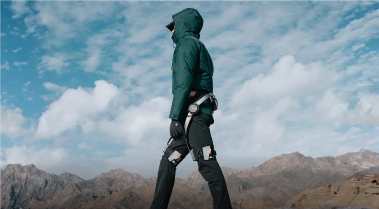 一般に、エクソスケルトンと聞くと、工場や介護の現場で重量物を扱うための大型機器を想像しがちだ。しかしHypershellは、より軽量でスマートな脚専用のウェアラブルデバイスとして開発された。装着は腰から腿の前面にかけて行い、Ω(オメガ)構造と呼ばれる独自のアーム機構が前後方向の脚の動きを効率的に増幅する。