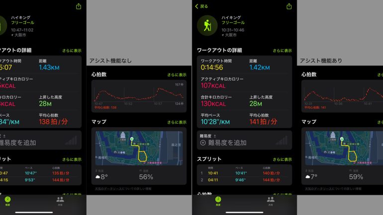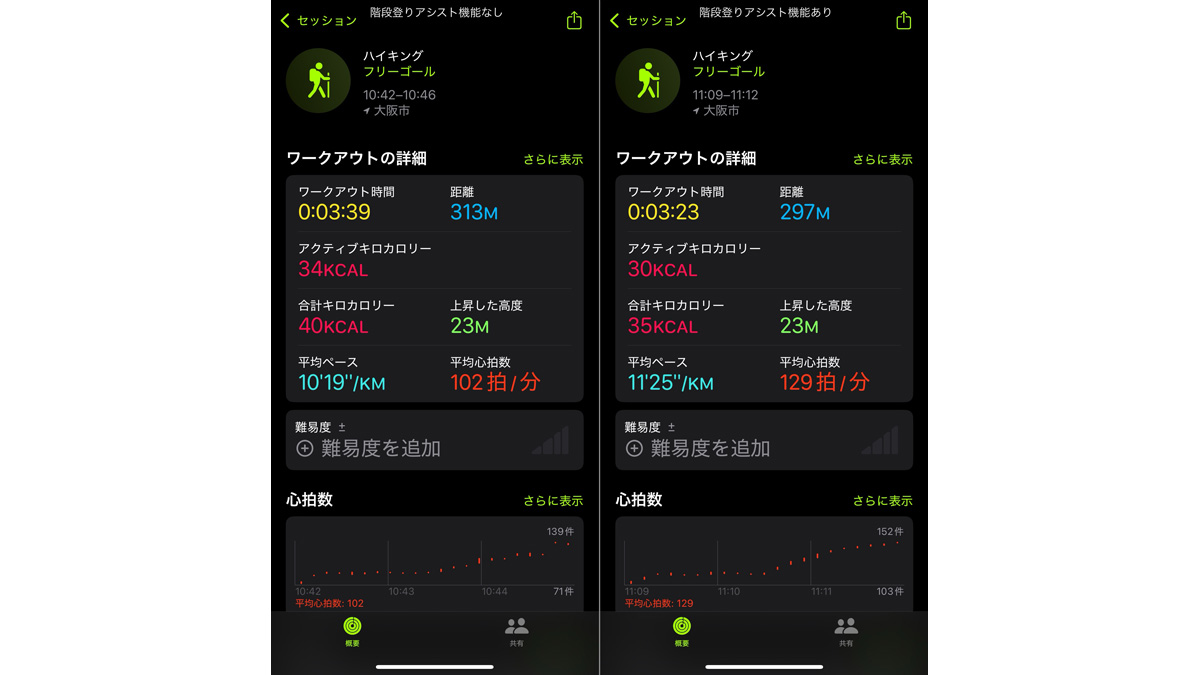 一方で、マンションの10階分の階段登り時に利用した際には、スピードや心拍数は上がるものの、消費カロリーは少なくなった。負荷が高い運動ではアシスト量が増えるため、このような逆転現象が起こるようだ。