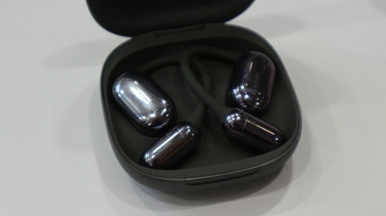 ワイヤレスイヤホン「Xiaomi OpenWear Stereo Pro」は、耳かけタイプのオープン型イヤホン。3点が耳に設置することで、圧力を分散しながら、しっかりとホールドしてくれる。コンパクトなヴィーガンレザーケースも、高級感があって印象的だった。