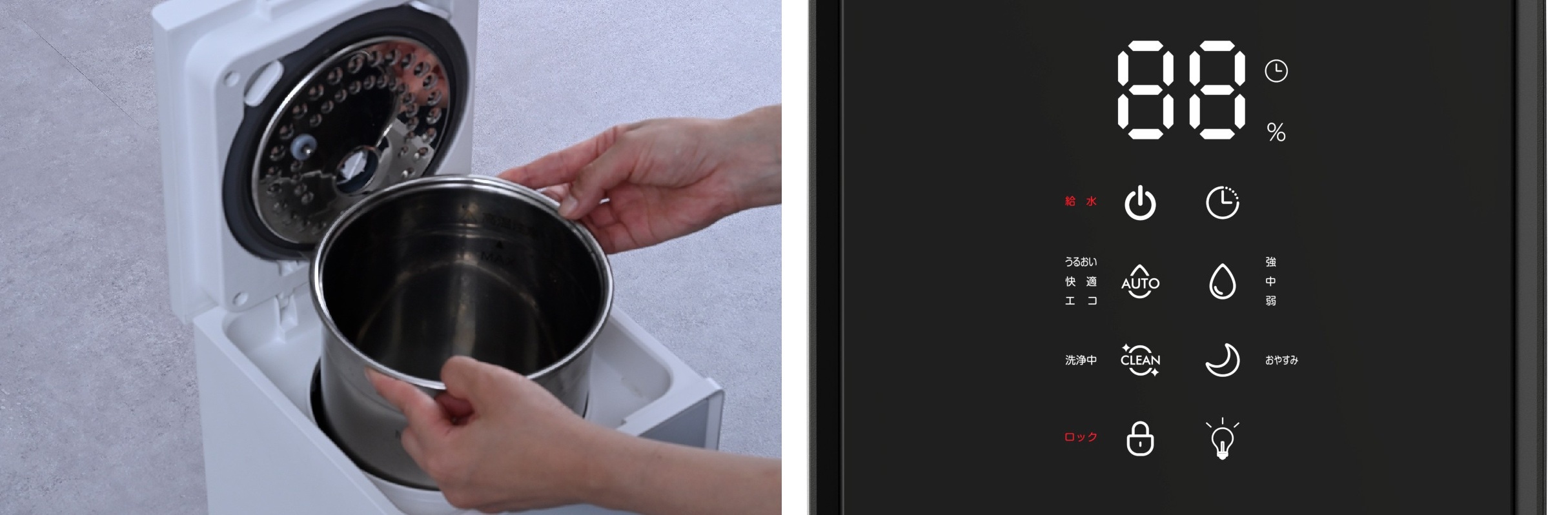 このほか、操作性やお手入れ性にもこだわっており、操作パネルは直感的でわかりやすいアイコンデザインを採用。水タンクは炊飯器のような釜形状なので脱着しやすく、丸洗いも可能だ。