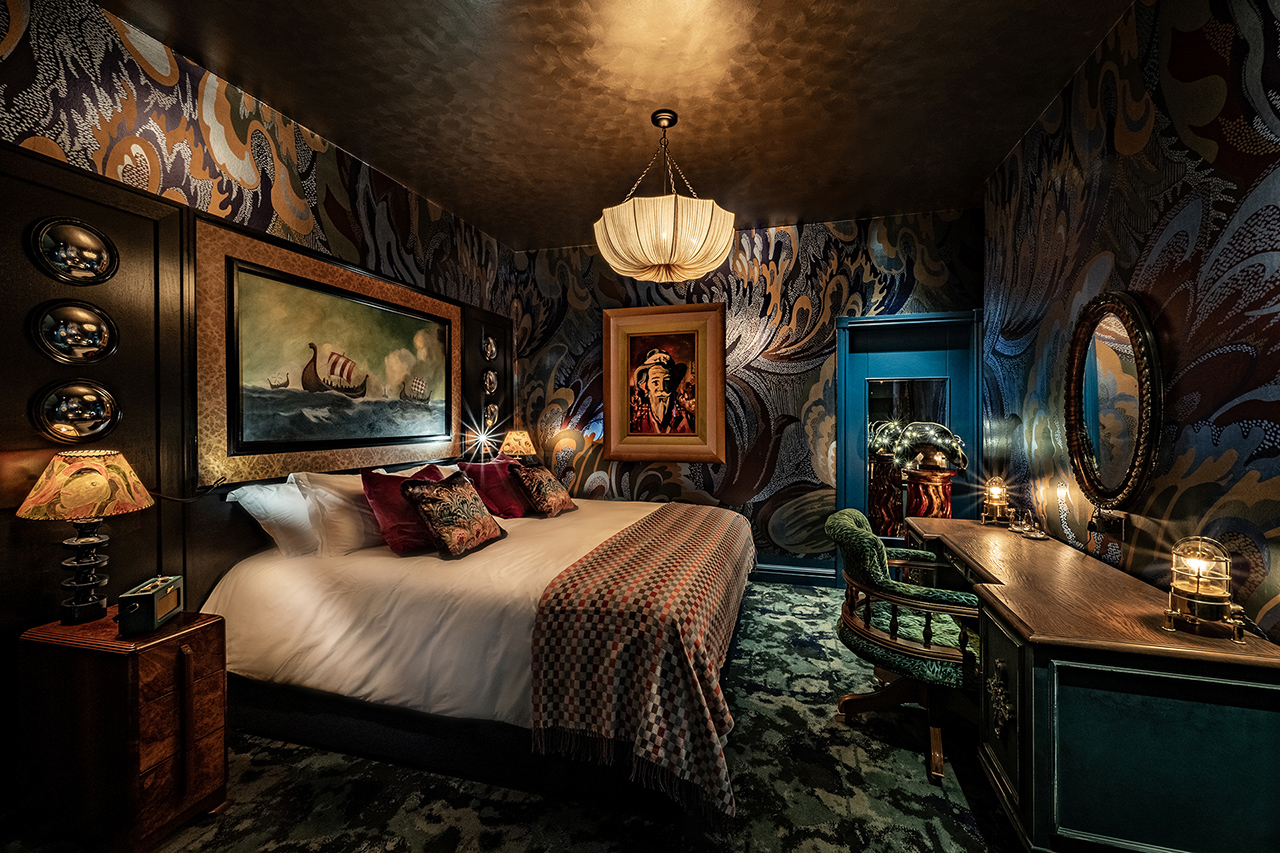 計12室の客室には、実際のポットスチルを用いた銅のウォールアートや、特注のボート型シャンデリア、さらに「Press for Smoke」と刻まれたボタンを押すと現れる秘蔵の一杯など、遊び心と洗練が融合した楽しい仕掛けが詰まっている。