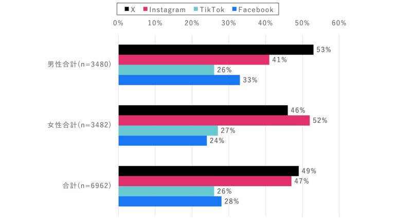 全性年代でX利用者の利用率が最も高くなっていたが、女性はInstagram・TikTok利用者の利用率も男性に比べ高くなっていた。