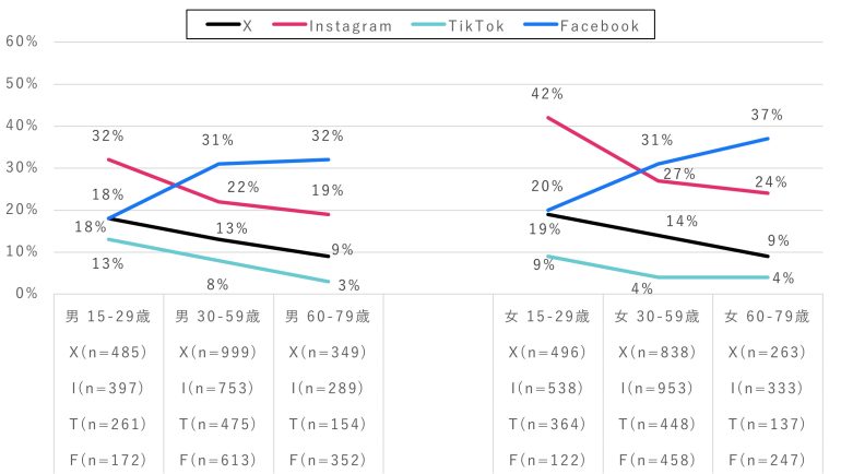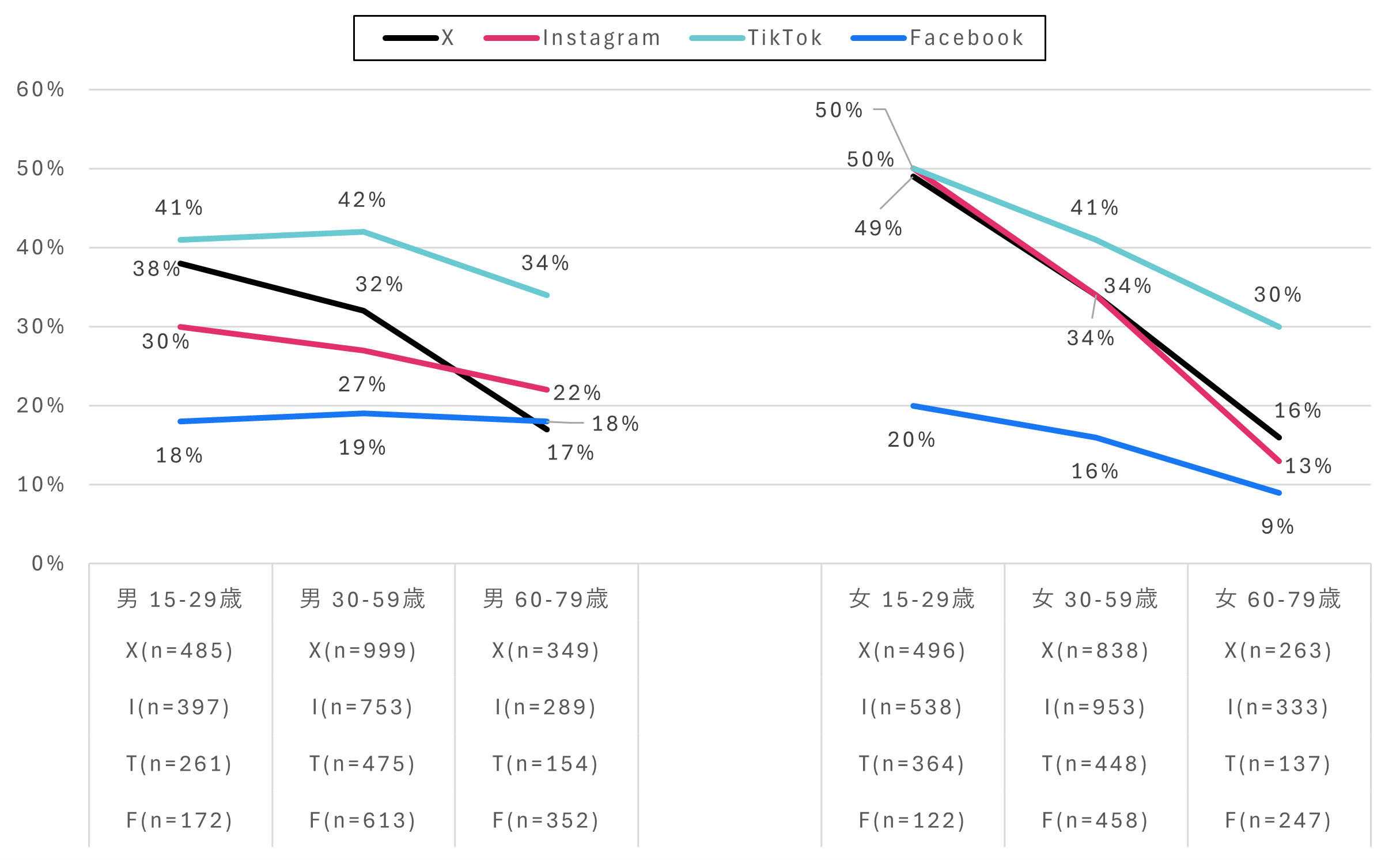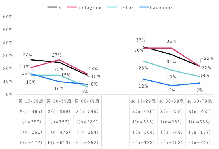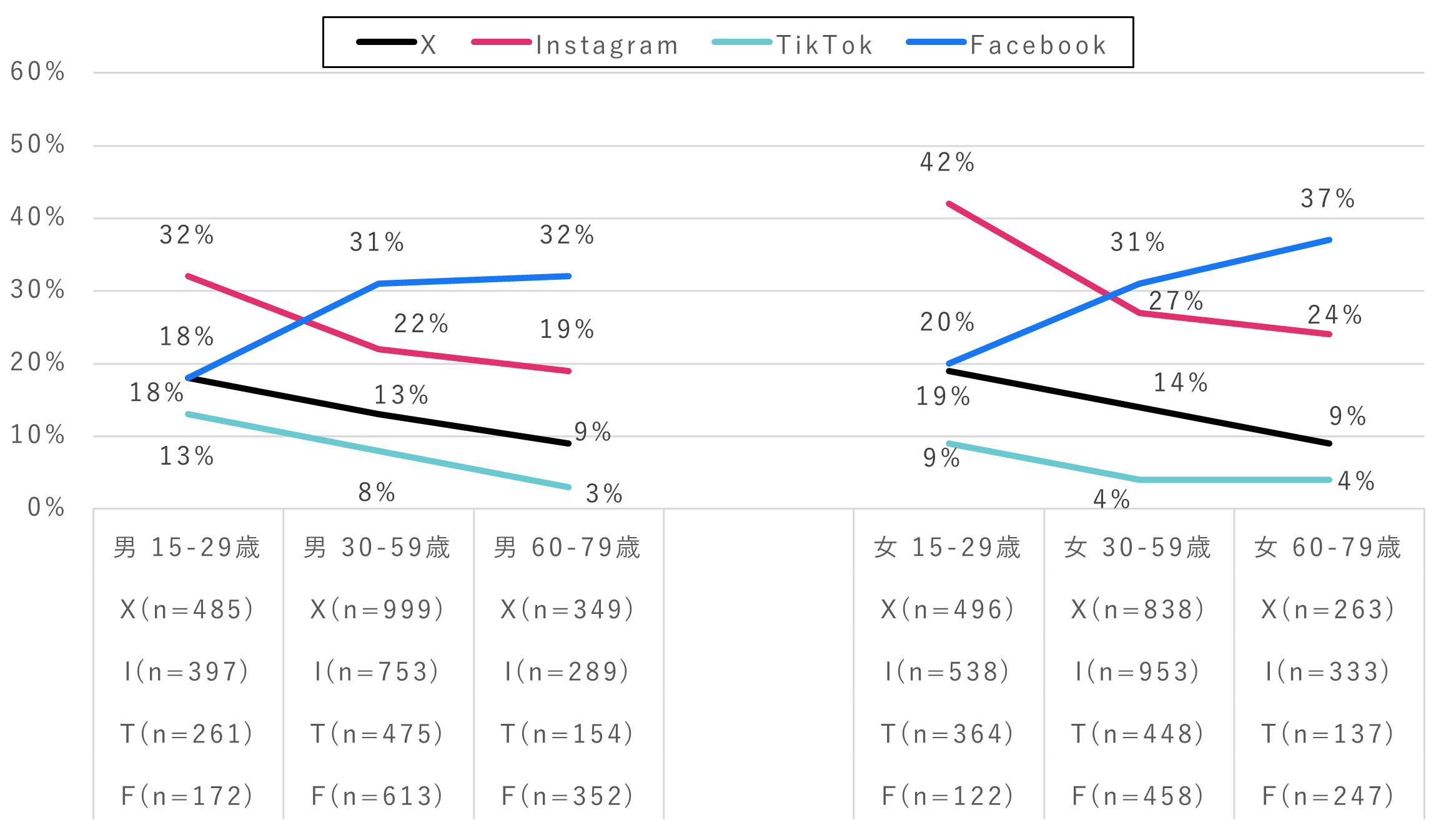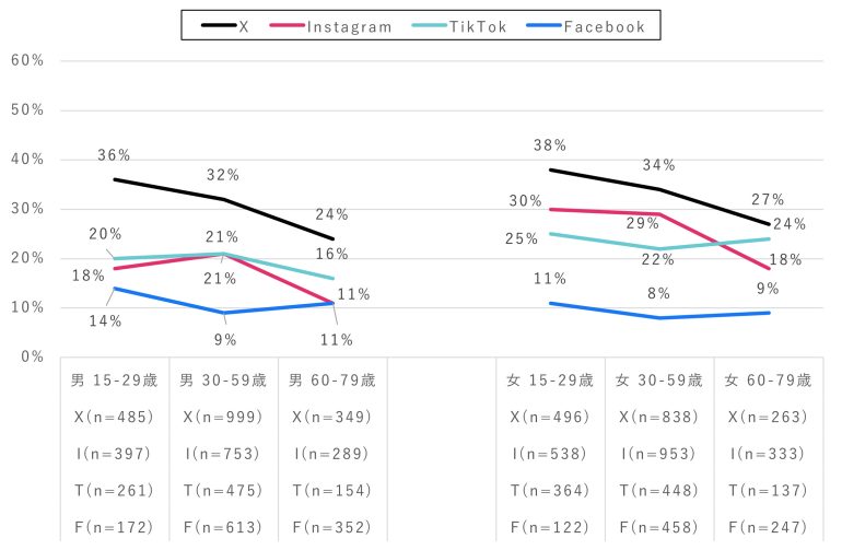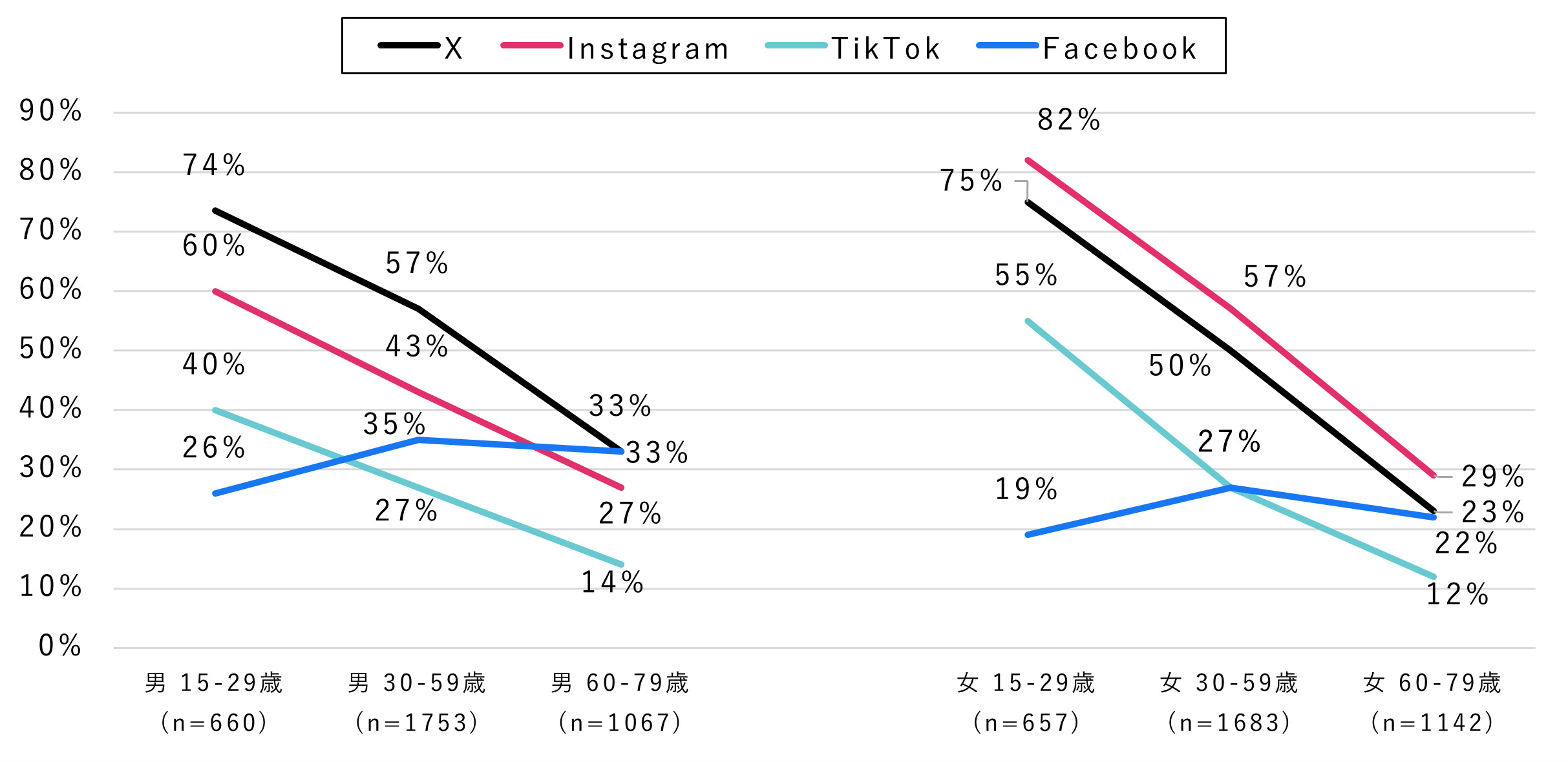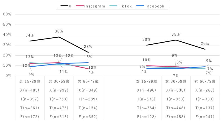 図2は、SNSの利用率を性年代別に見たものだ。各世代においても、男性はX、女性はInstagramの利用率が高くなっていたが、男性60代以上では、Facebookの利用率もXと同程度の33%となっていた。X、Instagram、TikTokは10-20代の利用率が最も高く、年代が上がるにつれて利用率は下がっていた。一方、Facebookは10-20代の若い世代の利用率が最も低くなっていた。